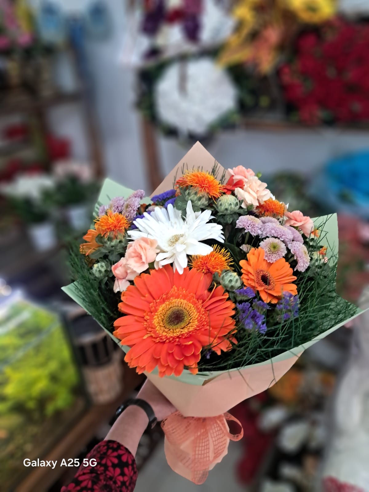 Fethiye’de doğal kır çiçeklerinden hazırlanan bu renkli buket, enerjik ve canlı bir hediye seçeneği sunar. Turuncu ve beyaz çiçekler, özenle aranje edilerek şık bir görünüm kazanır. Doğum günü, kutlama veya özel sürprizler için mükemmeldir.